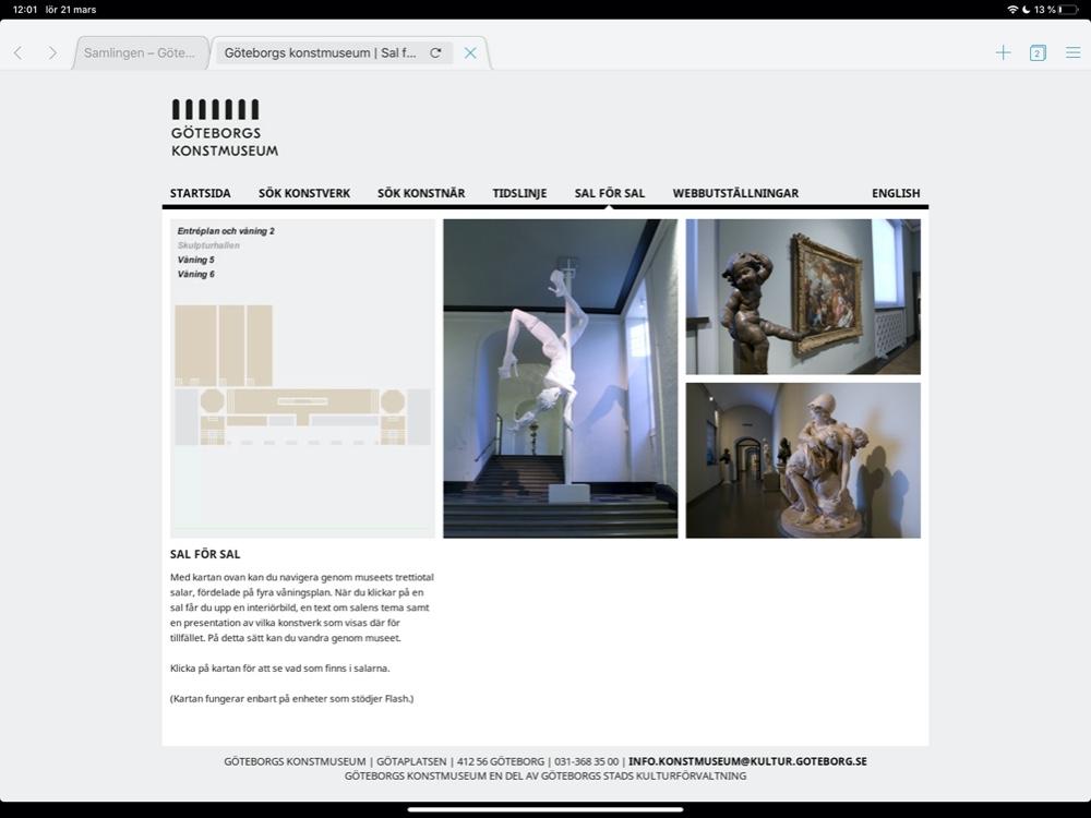 De har också ett Digiseum, ett digitalt museum för dig i soffan. https://goteborgskonstmuseum.se/besok-museet/digiseum/ med länkar till var du kan hitta mer. Om du använder en iPad så kanske du behöver en annan webbläsare typ Puffin Browser för att använda Flash på vissa webbsidor.