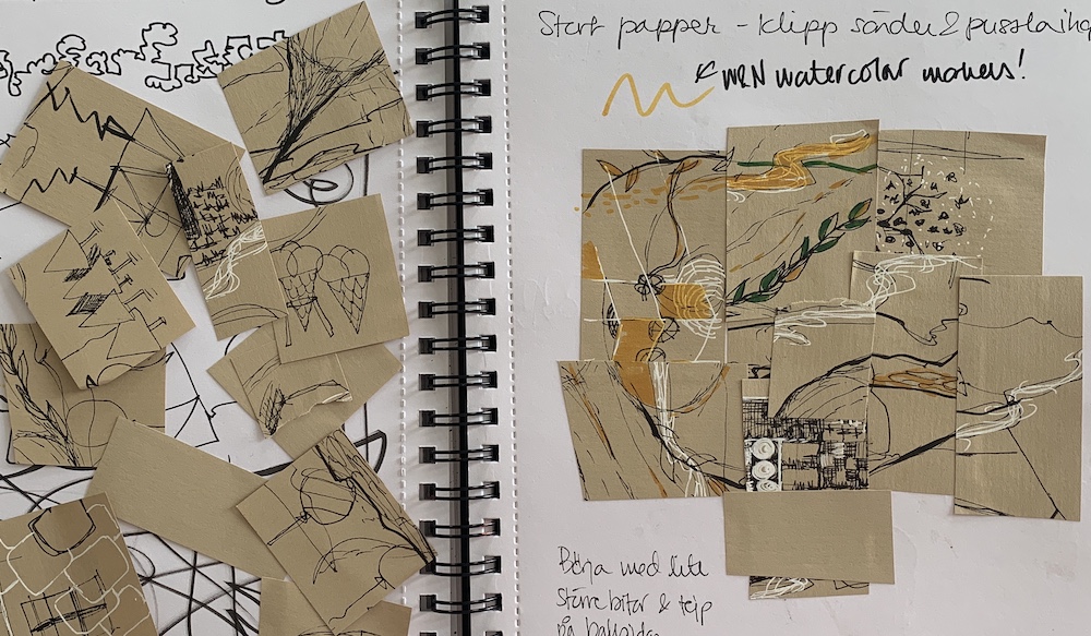 När du har samlat ihop allt gammalt – eller gjort alldeles nytt för att ha något att klippa sönder – så titta på ditt klotter. Liknar de varandra – är de släkt på något sätt? Vad är din minsta gemensamma nämnare? Har det med linjer, former eller något annat att göra? Har du kanske ett motiv som återkommer igen och igen?