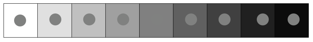 Det är alltså den omgivande valören som bestämmer hur vi upplever den gråa punkten. Detta kallas för simultankontrast. Så även om vi upplever att en färg är ljusare eller mörkare grå så har det att göra med vilken valör som är intill. All färg är relativ. Samma grå nyans kan uppfattas på helt olika sätt beroende på dess omgivning.