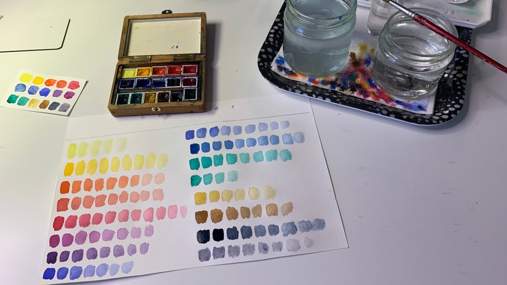 När du undersöker vilka färger du har i din låda eller som du har hemma kan det vara bra att göra en valörstege med varje färg du har i kaka eller tub. Detta är för att upptäcka hur mättad färgen kan vara (hur stark den är på pappret nästan outspädd) och hur omättad den kan vara (hur utspädd den kan bli). Olika pigment har olika långa valörstegar.