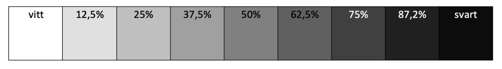 Måla en 9 gradig valörskala med flytande tusch, akvarell eller gouache, från vitt till svart. Nr 5 ska vara mellangrå. Den mörkaste överst och den ljusaste nederst. Storleken på delarna i skalan behöver vara 3×3 cm. Gråskalan ska du fortsätta att lägga färger intill – så den behöver ligga i mitten eller i kanten av en sida när du klistrar in den i din loggbok.