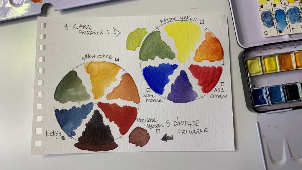 Den klarare färgtoncirkeln är mer klassisk: Winsor Yellow, Ultramarine och Alizarin Crimson. Jag valde dessa färger för jag ville visa att man kan få fram en fin violett en fin grön och en fin orange även om man inte har den rekommenderade paletten.
