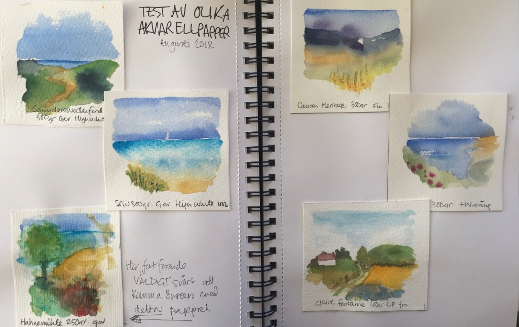 Jag gör gärna den här övningen när jag vill pröva både färg, penslar och papper tillsammans. Här har jag prövat olika papper och med färger från en ny låda – förälskade mig i Schminkes Cobalt Turquoise på Saunders & Waterford-papper som kallas High White med Grov gräng. Vilka gröna kan du blanda fram?
