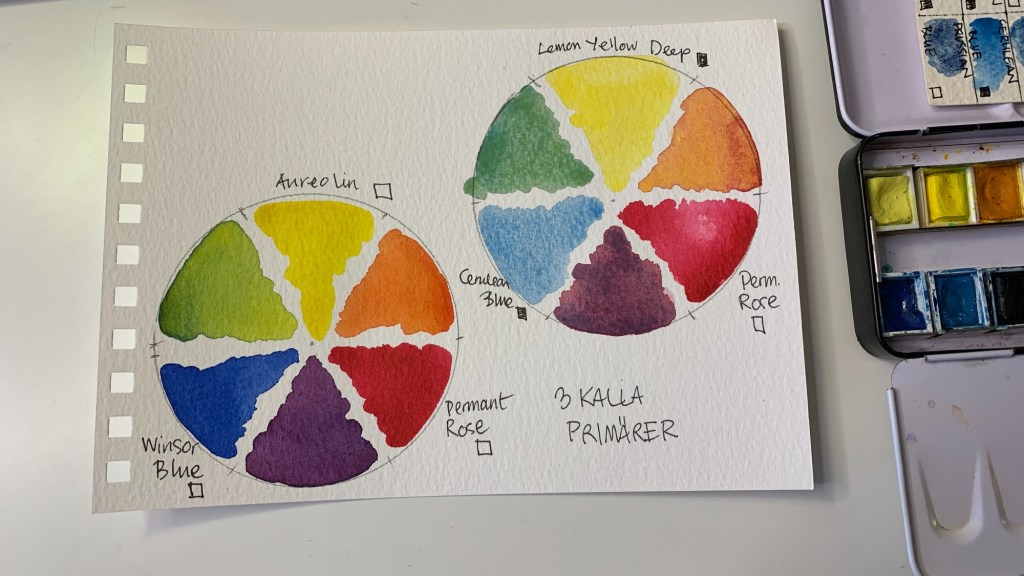 Här har jag använt Aureolin, Permanent Rose och Winsor Blue – tre transparenta primärer till cirkeln till vänster. Sedan prövade jag Lemon Yellow Deep och Cerulean Blue – som båda är opaka och Permanent Rose. jag ville ha fram en finare violett. Det gick sådär.